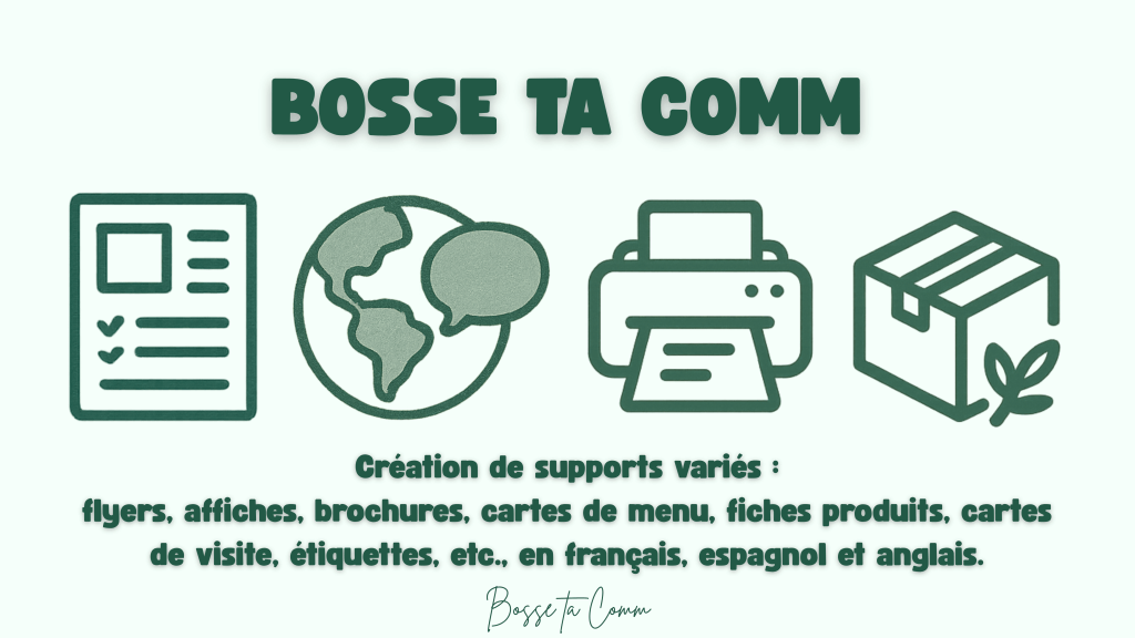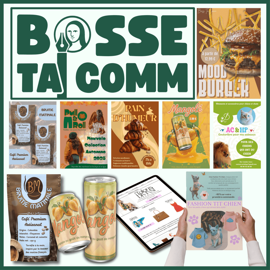 L’agence BOSSE TA COMM vous accompagne dans la création de vos supports de communication et vous offre :