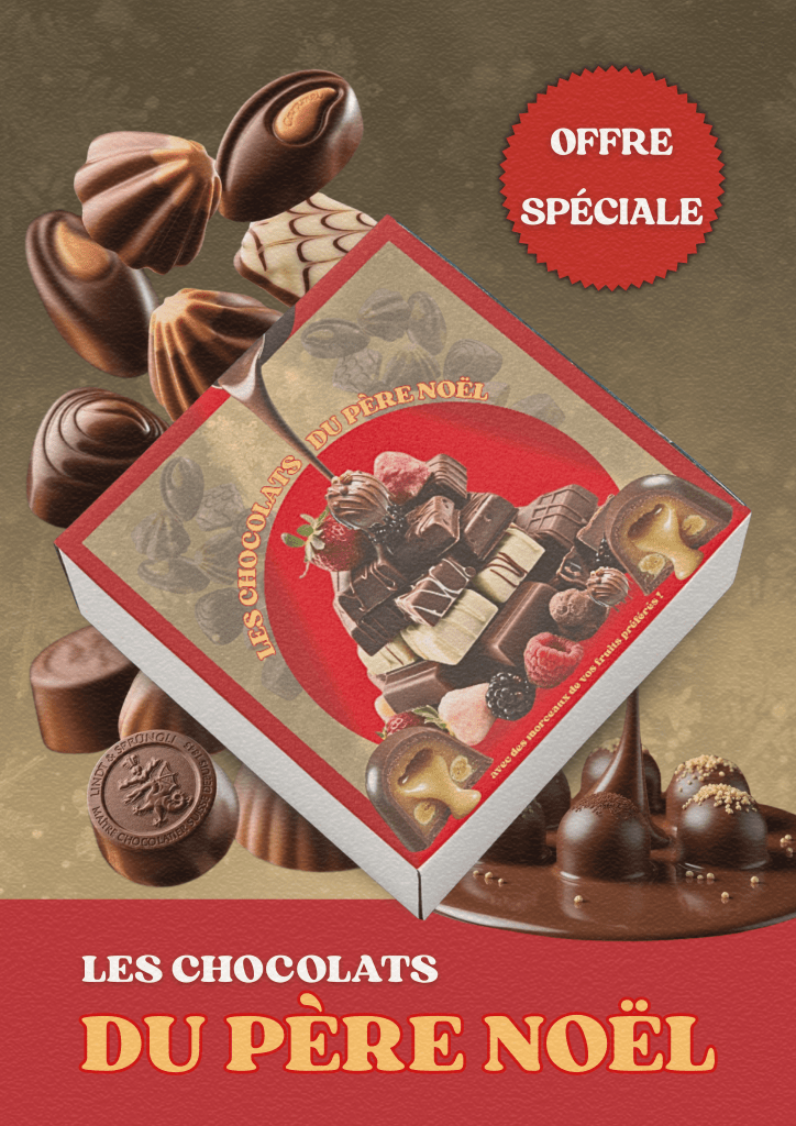 Objectifs : Développer une identité visuelle festive et chaleureuse pour la collection spéciale de chocolats de Noël.
