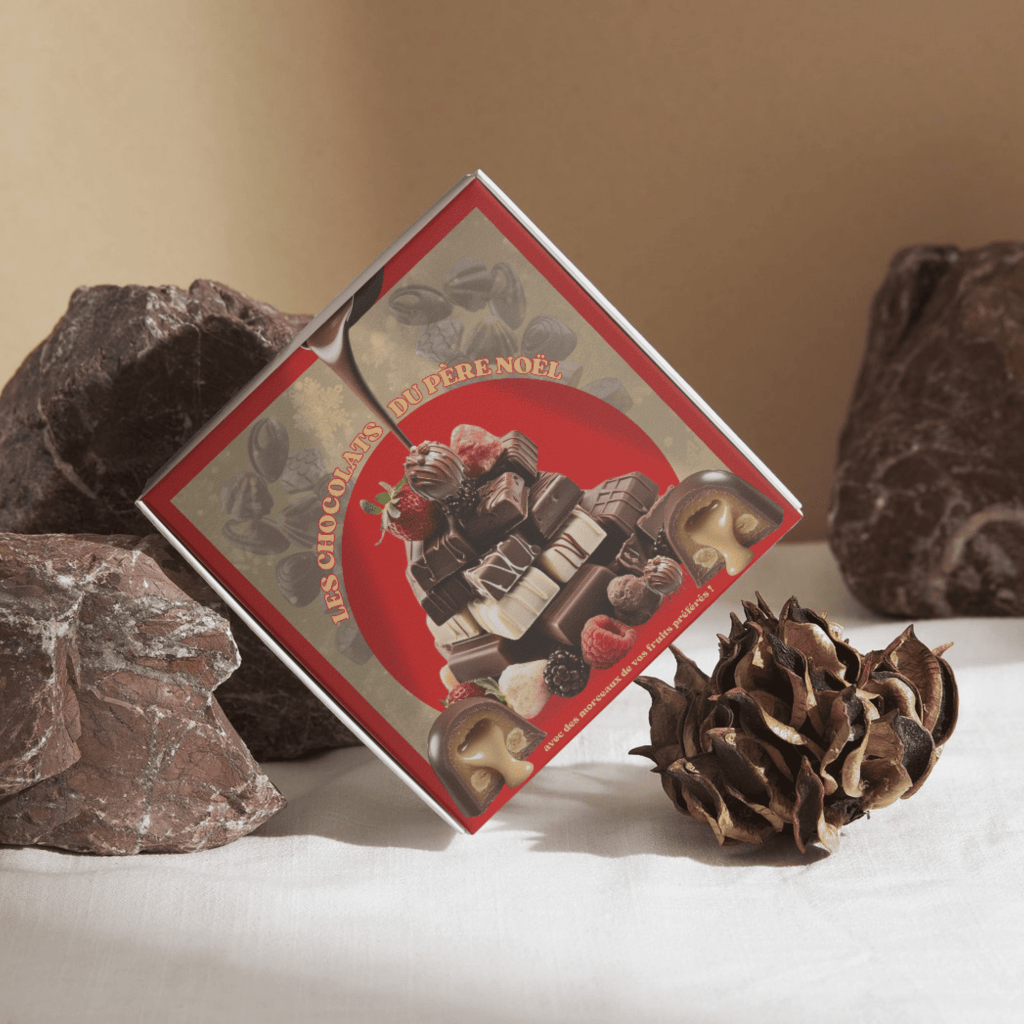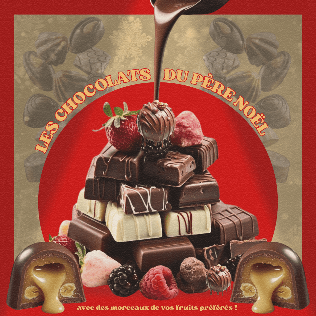 Brief : Bazar Doux souhaite une couverture de boîte élégante, colorée et inspirée de l’esprit de Noël pour présenter sa gamme spéciale “Les Chocolats du Père Noël”. Le design doit évoquer la magie des fêtes : textures chaleureuses, couleurs traditionnelles, ambiance cosy et mise en scène appétissante des chocolats.