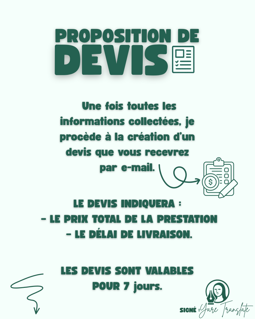 Les prix varient en fonction du type de document, de la langue, du design et de la complexité du projet. Une fois le formulaire rempli, vous recevrez un devis complet dans votre boîte mail.