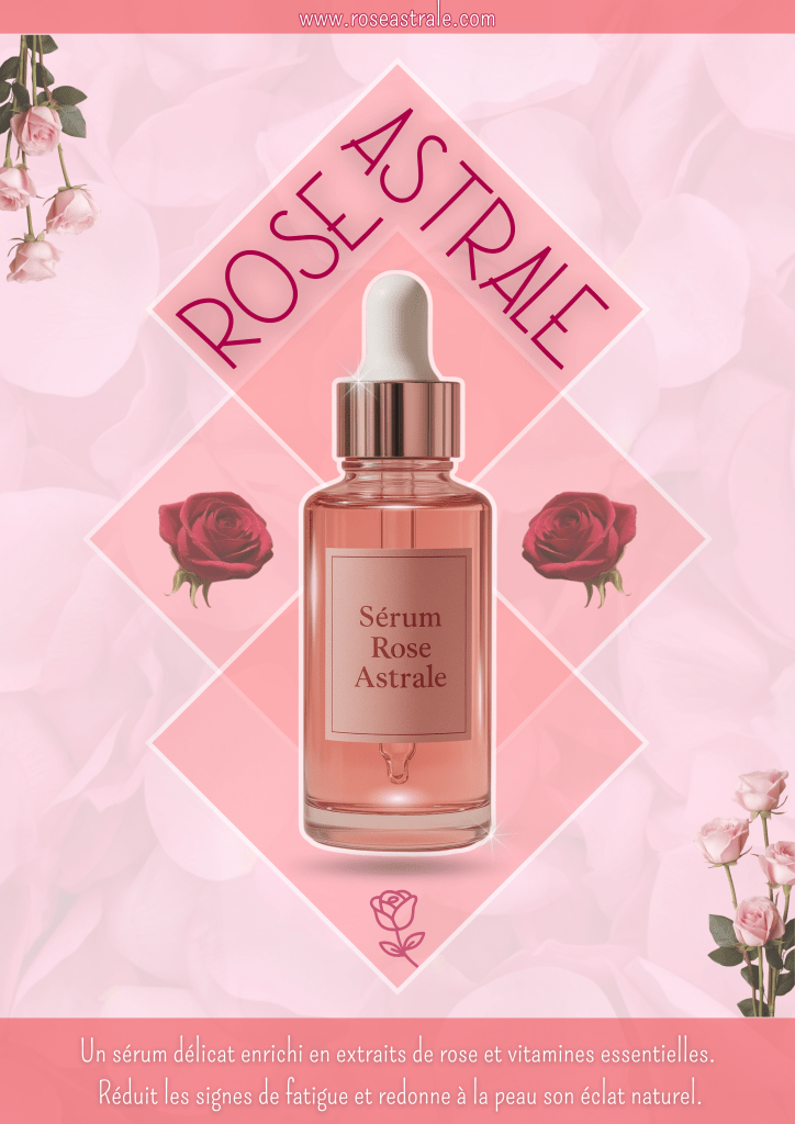 Objectifs: Concevoir un support visuel raffiné, en harmonie avec l’univers de la cosmétique traditionnelle. Mettre en valeur le sérum Rose Astrale en soulignant ses bienfaits naturels.