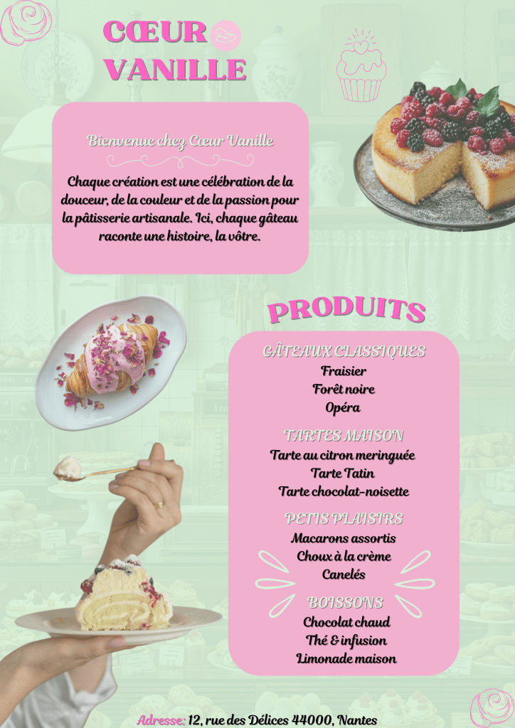 Projet: Conception d’un flyer A4 destiné à présenter les produits de la pâtisserie.