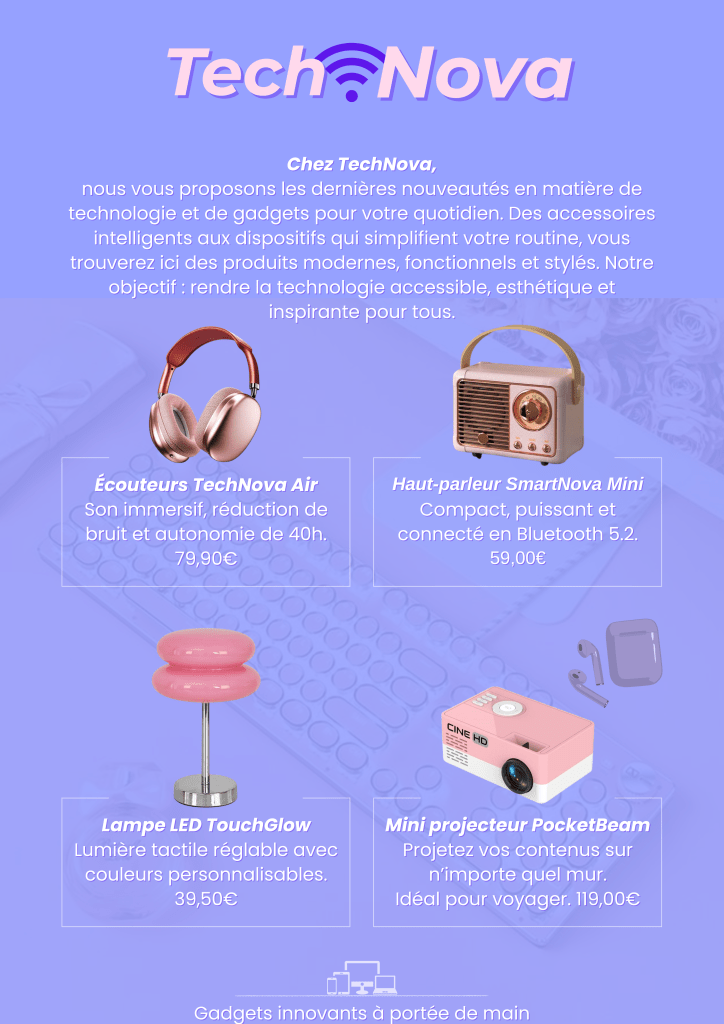 Projet: Réalisation d’un flyer promotionnel présentant une sélection de gadgets technologiques.