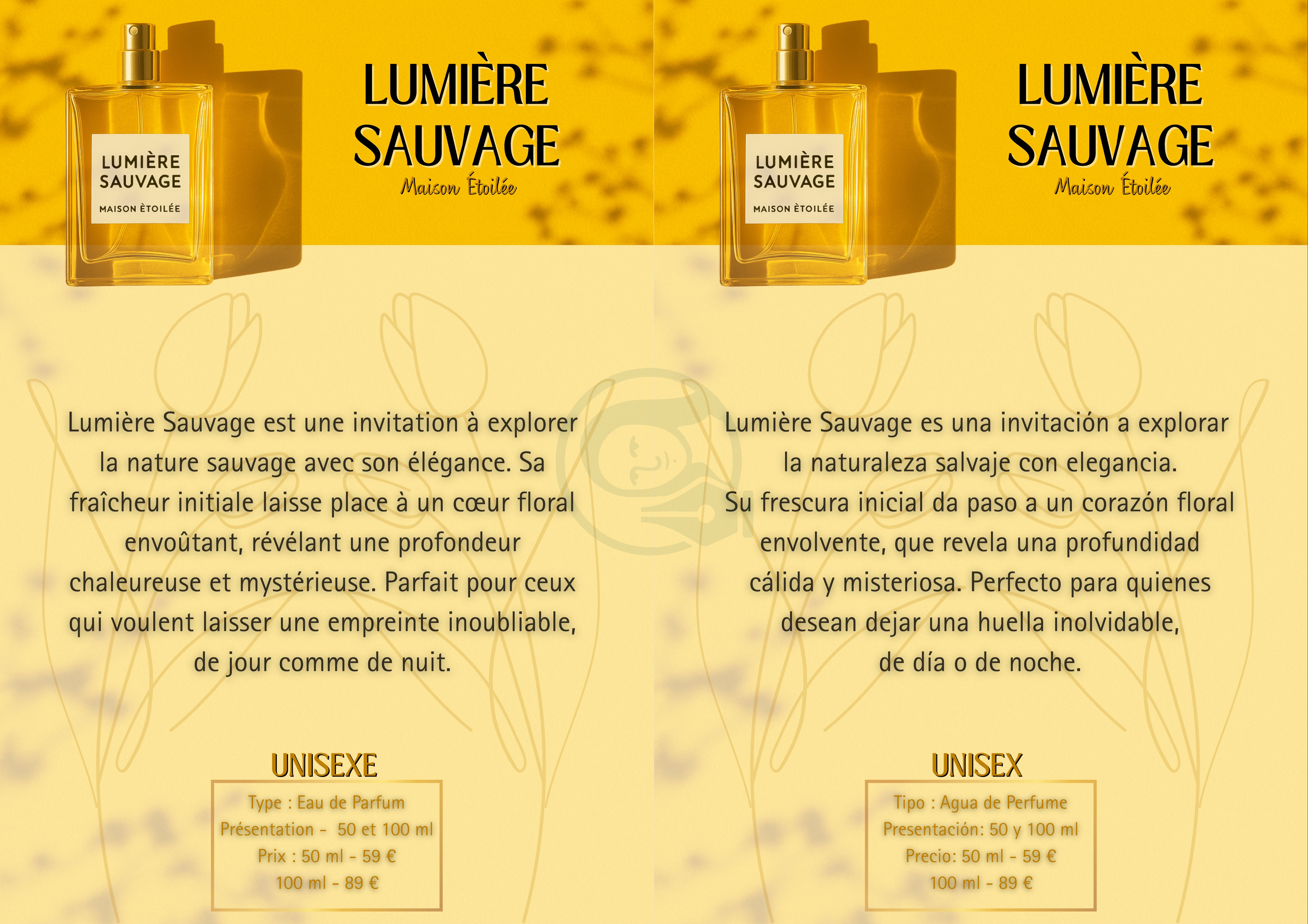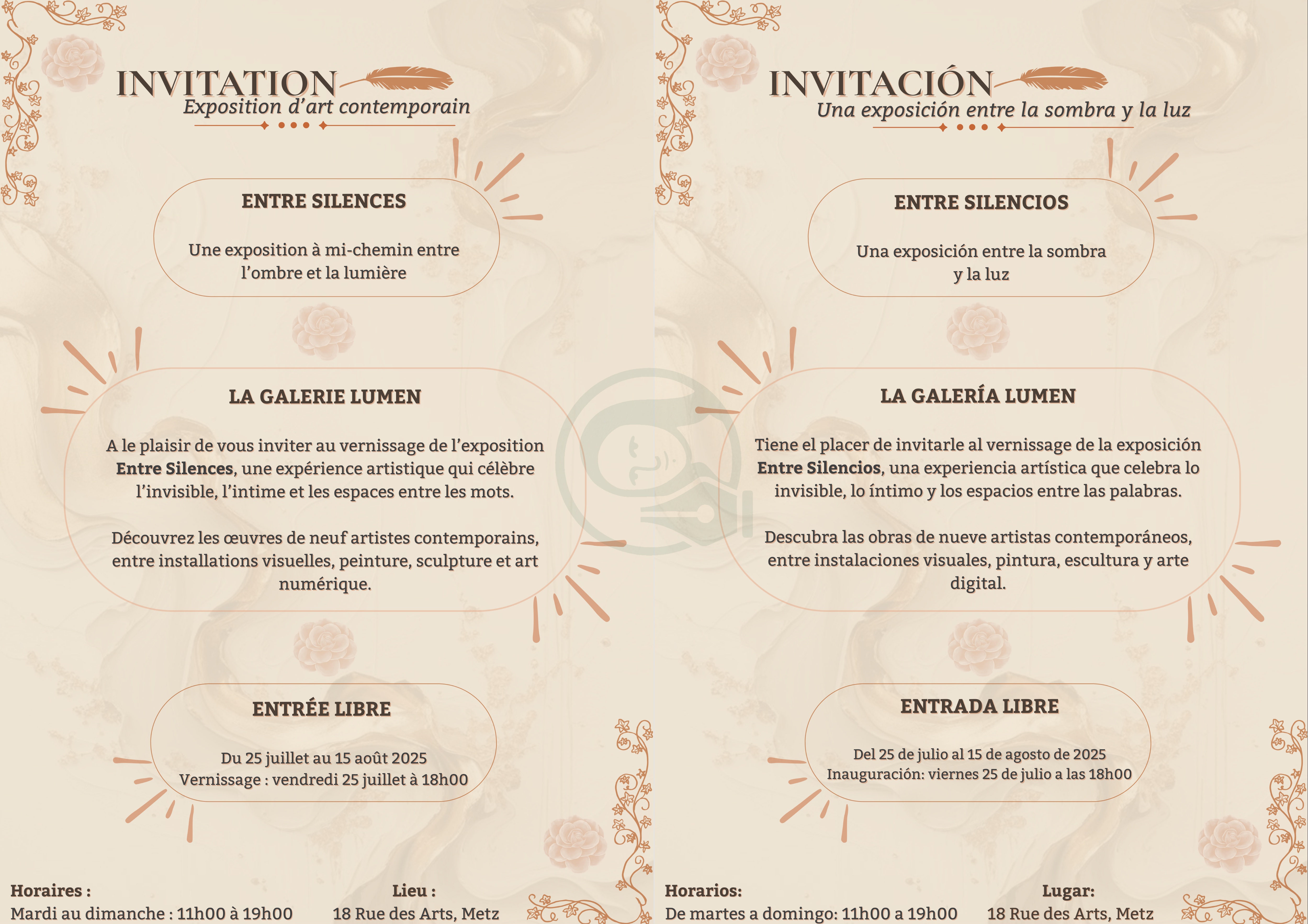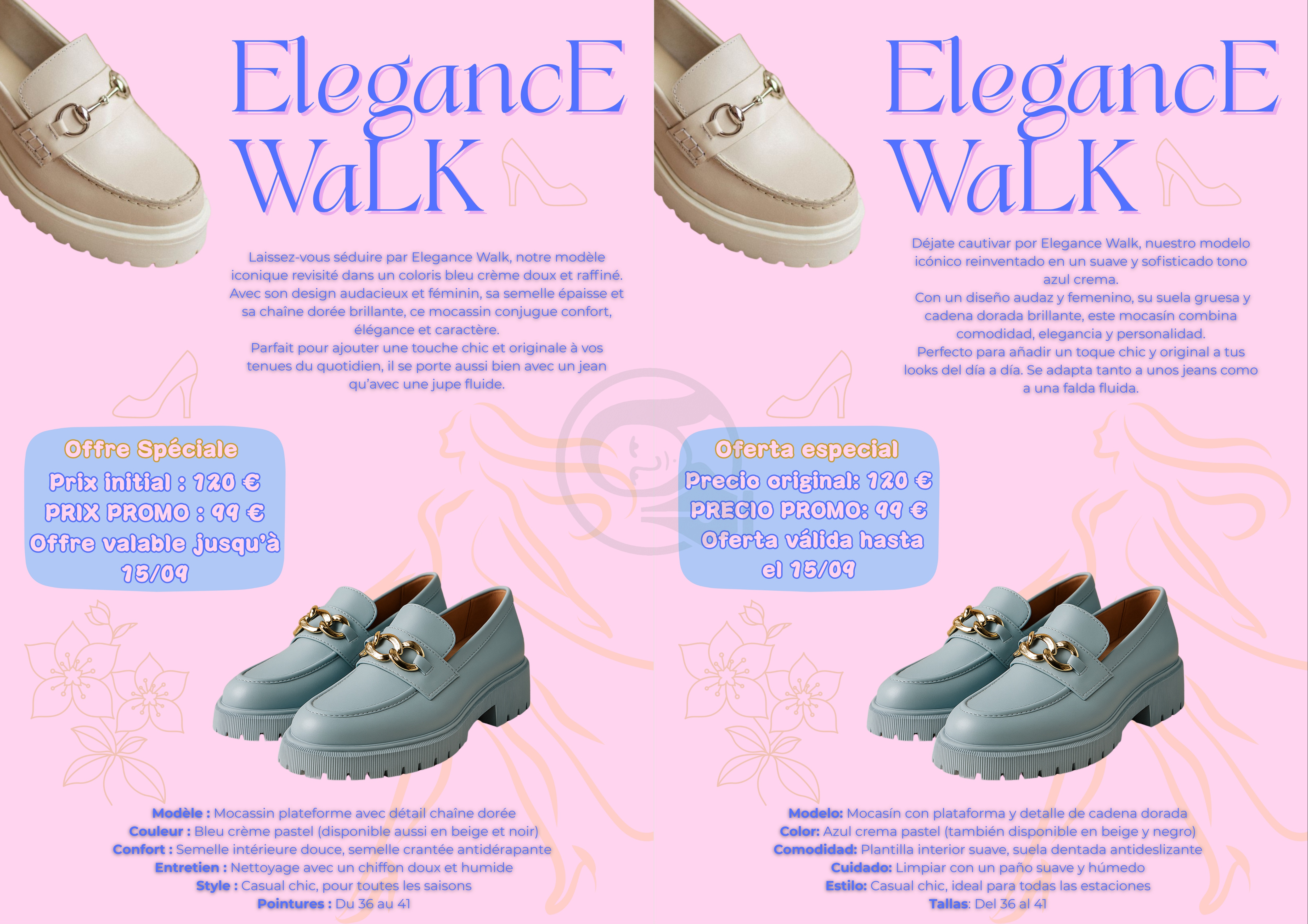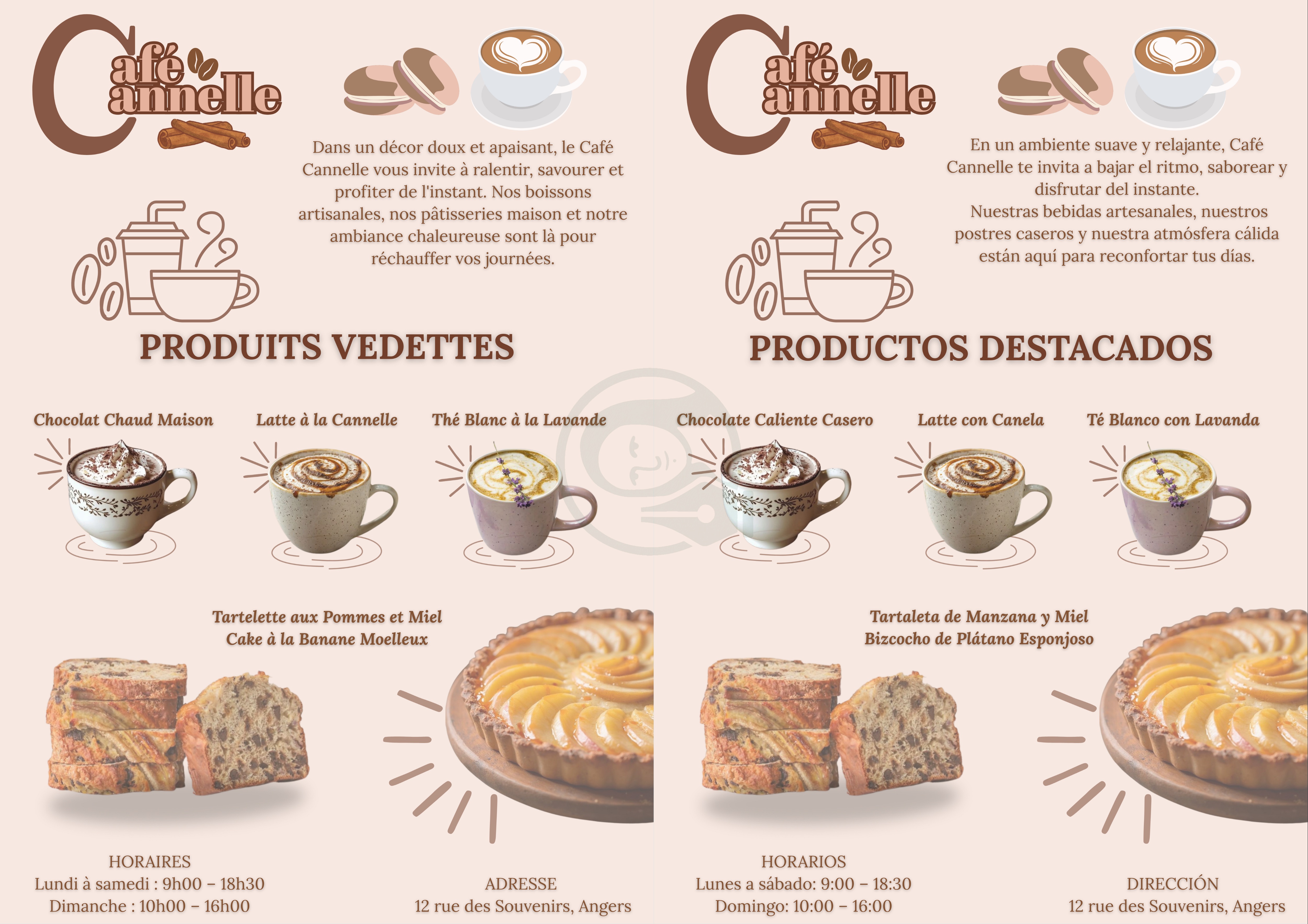 Brief: Format A4. Langues: FR-ES, palette de couleurs pastel, typography combinée et contrastées, intégration d’illustrations.