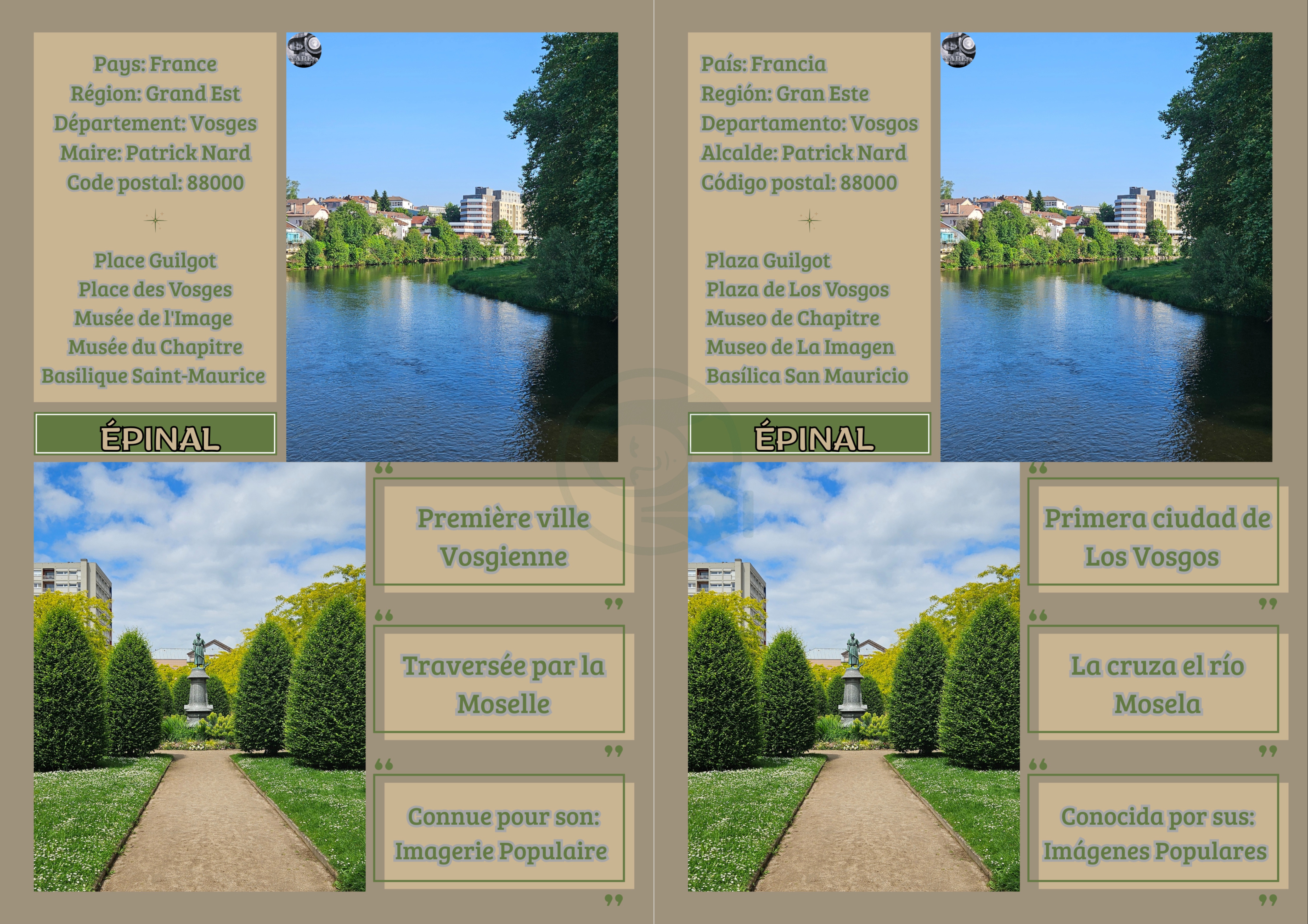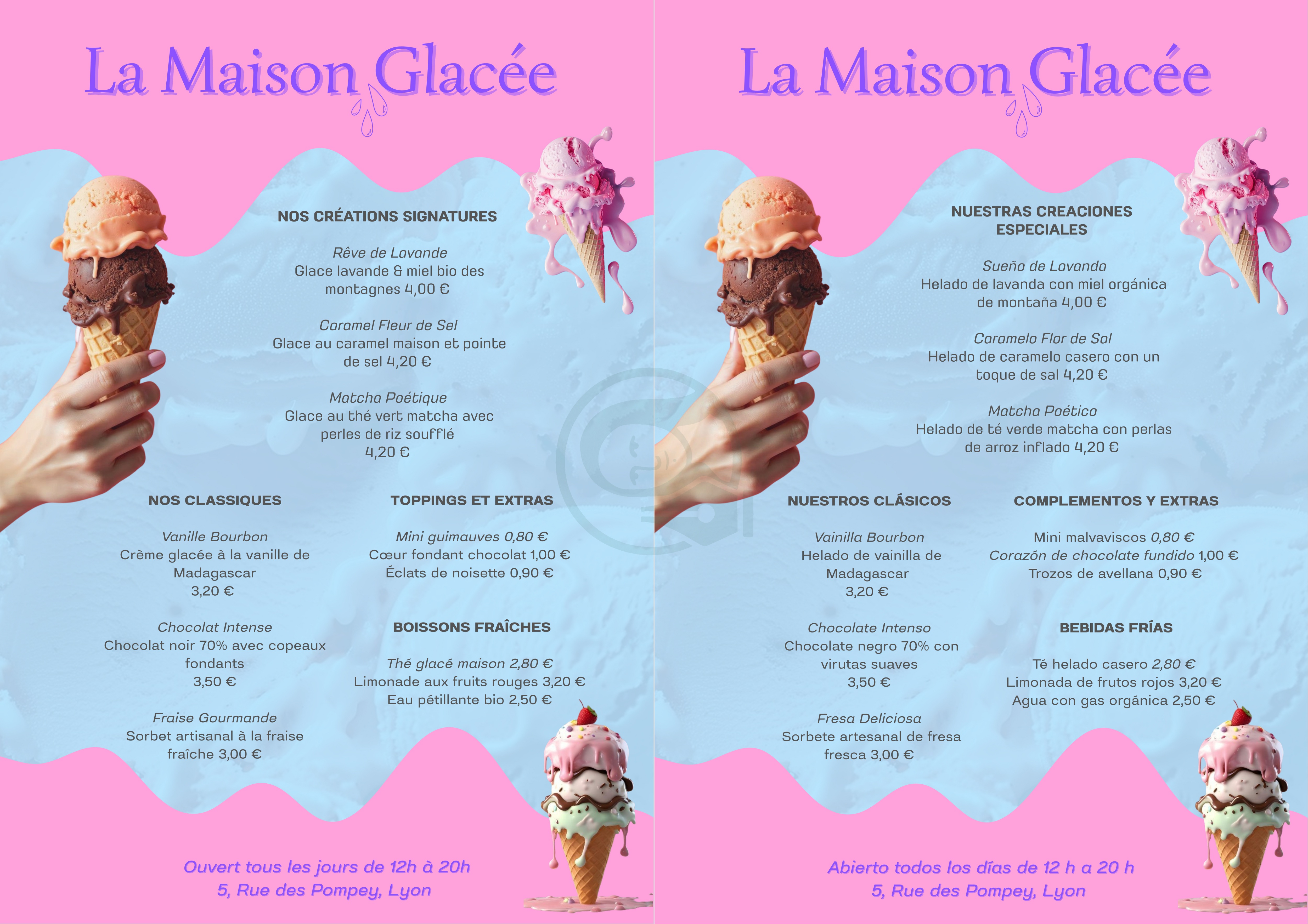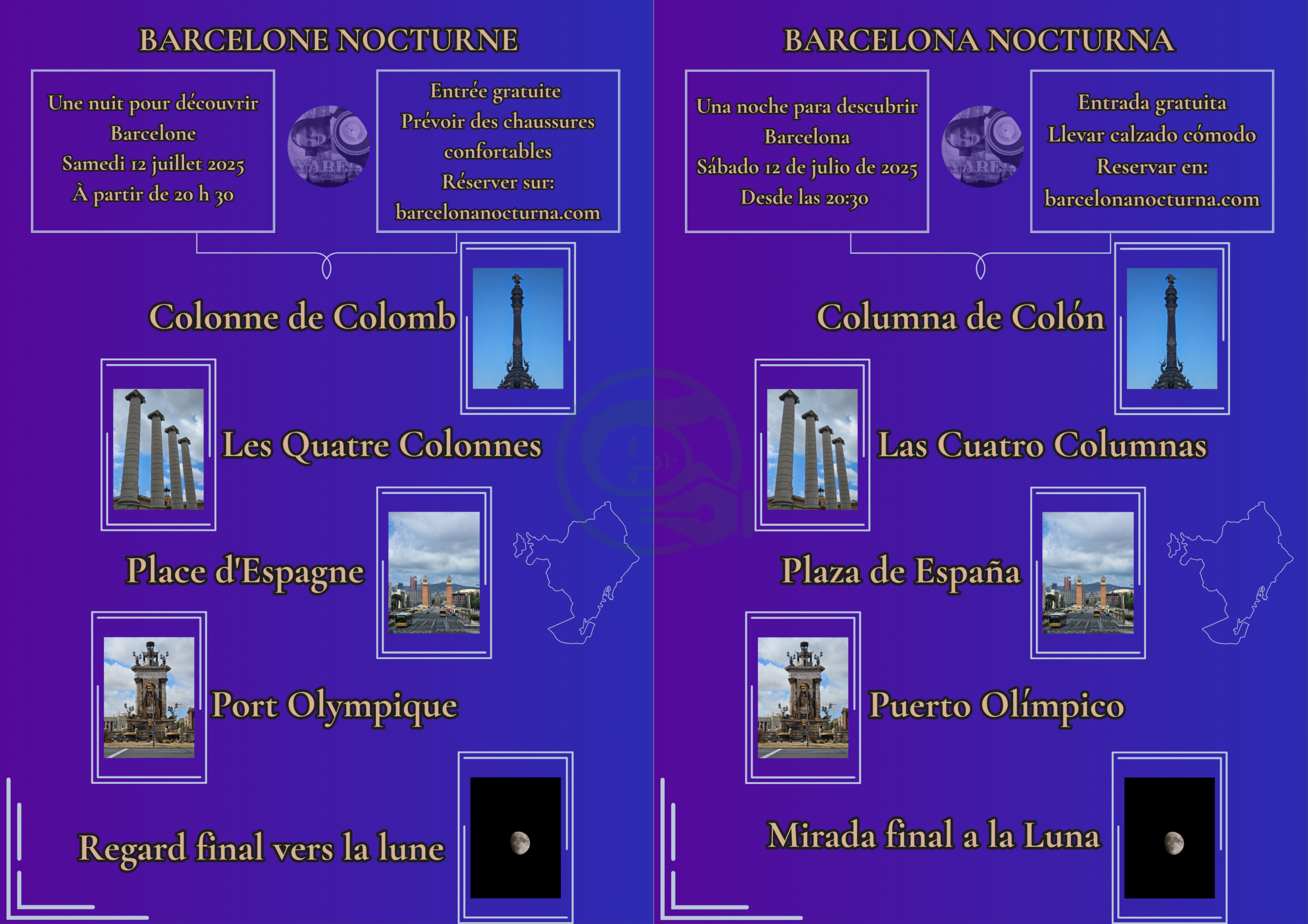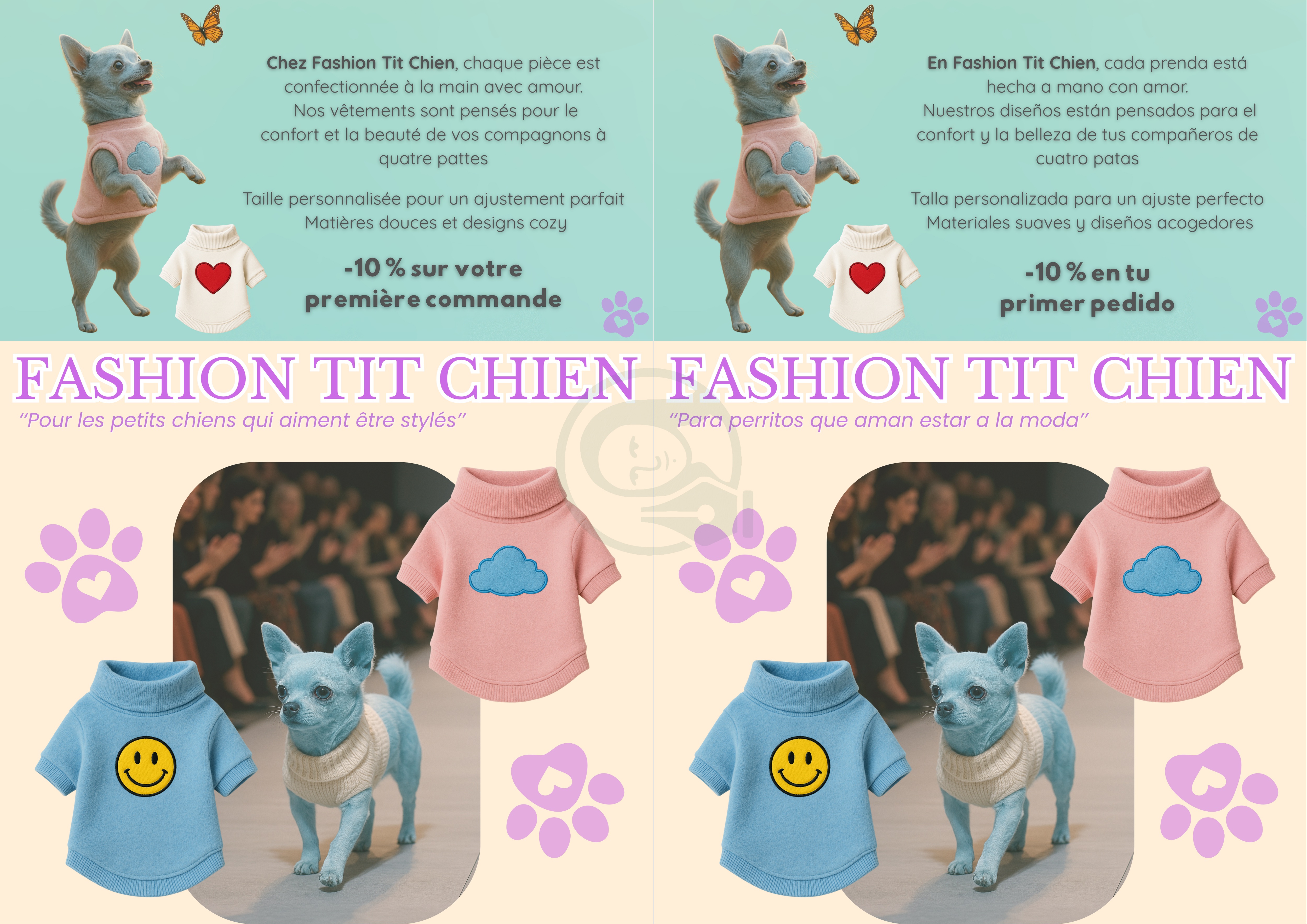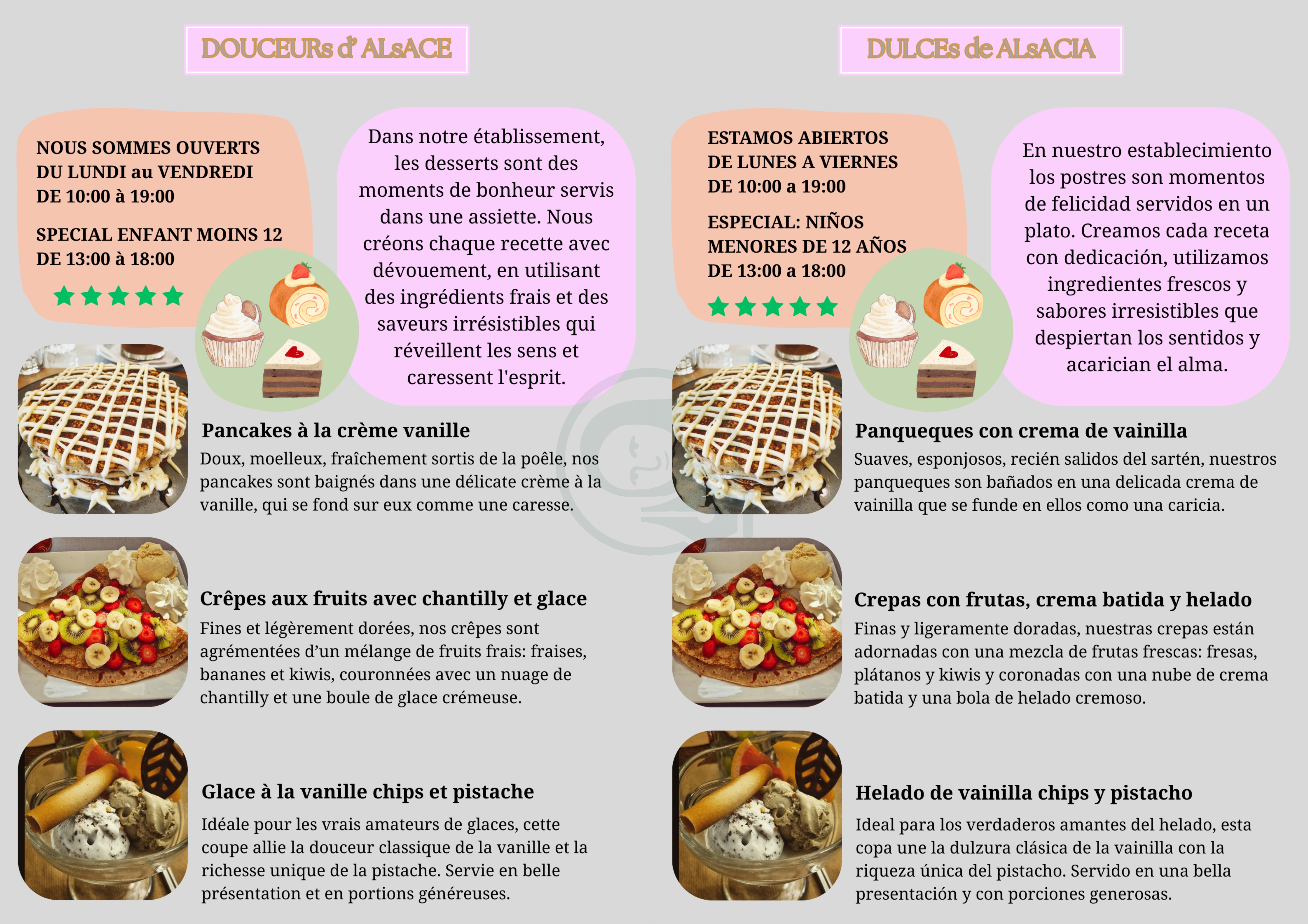 Brief: Format A4. Langues: FR-ES, palette de couleurs pastel, typography combinée et contrastées, intégration d’illustrations.
