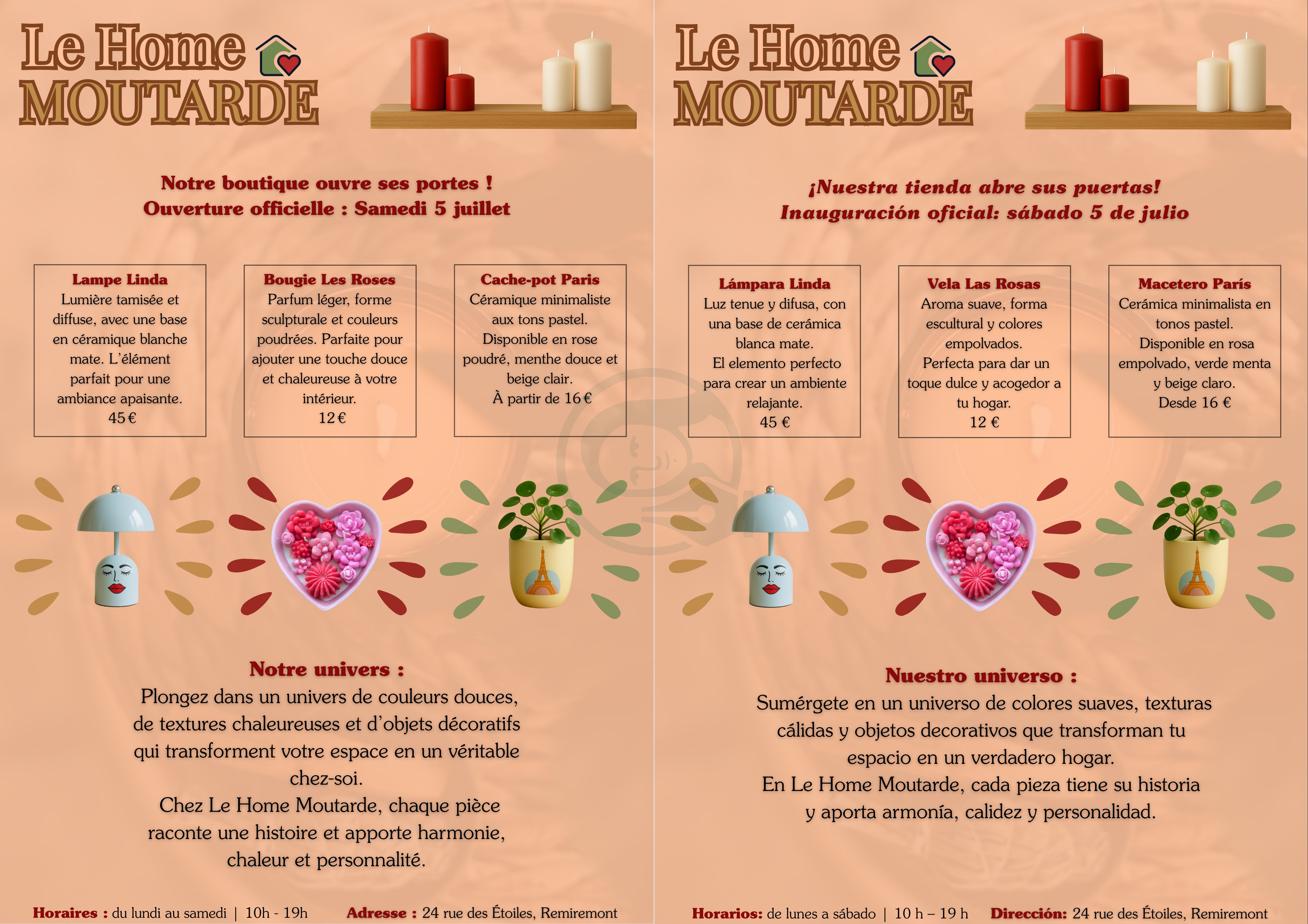 Projet: Création d’un flyer de présentation bilingue (français / espagnol) au format A4 pour une boutique de décoration.
