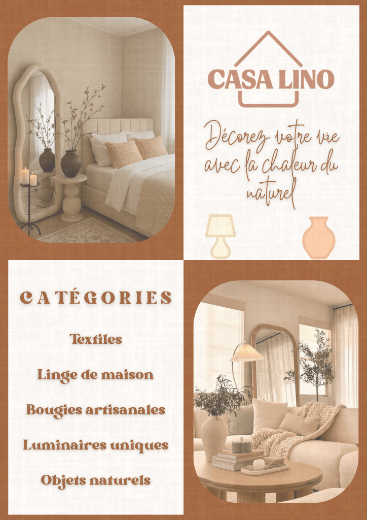 Objectifs: Concevoir un support visuel chaleureux et naturel, fidèle à l’univers de la décoration artisanale. Mettre en valeur les catégories de produits de Casa Lino en soulignant leur authenticité et leur esthétique apaisante.